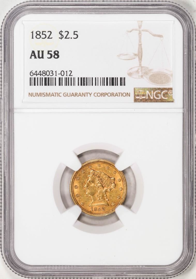 One 1852 $2 1/2 Liberty Head Quarter Eagle Gold Coin NGC AU58. NGC Certified.