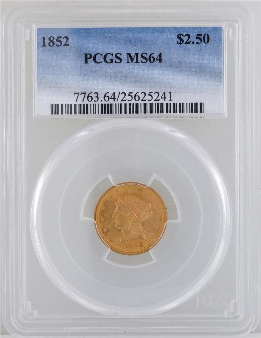 One 1852 $2 1/2 Liberty Head Quarter Eagle Gold Coin. PCGS certified. PCGS Certified.