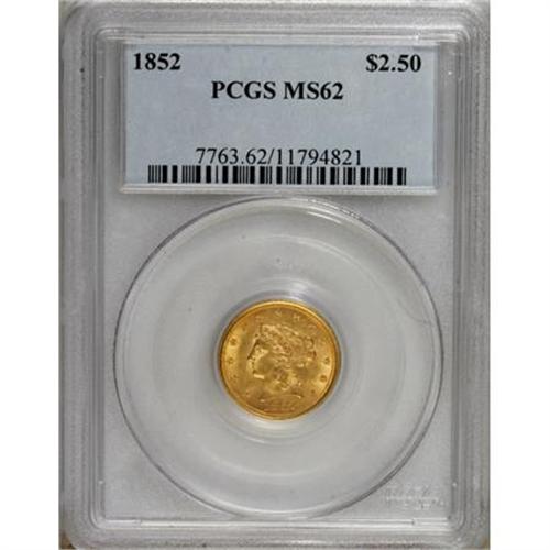 <B>1852 $2 1/2 MS62 PCGS.</B></I> A subtly lustrous butter-yellow representative of this quarter eagle issue, one struck during the heyday of the California gold rush. Minimally marked overall, though abrasions are noted in the right obverse field.<BR><BR><B>Coin Engraver:</B> Christian Gobrecht<BR><BR><b>Shipping:</b> Coins & Currency (<a target="_blank" href="http://www.heritageauctions.com/common/shipping.php">view shipping information</a>)
