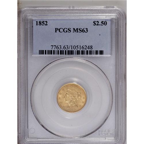 <B>1852<$2 1/2> MS63 PCGS.</B></I> A nicely struck and carefully preserved representative with slightly muted, reddish-golden luster. A thin, barely noticeable scratch extends from the back of Liberty's hair between stars 11 and 12. A high mintage issue, but surprisingly scarce in better Mint State grades.