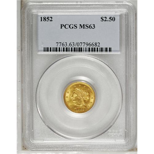 <B>1852<$2 1/2> MS63 PCGS.</B></I> Brilliant lemon-yellow color with fully lustrous surfaces and exceptional eye appeal. This sharply struck Mint State example is free of any significant abrasions. The lower obverse die is shattered with a heavy die crack through the date, to the border left of the 1. This crack actually distorts the symmetry of the border.