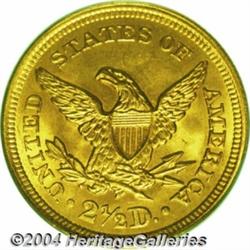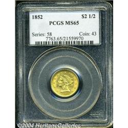 <B>1852<$2 1/2> MS65 PCGS.</B></I> The 1852 has an original mintage of 1.1 million pieces, a total that confirms its status as one of the more easily obtainable quarter eagles from the 1850s. Relative to the number of high quality gold collectors in today's hobby, however, Gems are rare. This copper-gold survivor displays smooth, lustrous surfaces, with the only mentionable mark occurring on Liberty's cheek. The strike is also uncommonly sharp, with the design elements showing nice definition throughout. Population: 7 in 65, 1 finer (3/04). <BR><BR><B>Important notice:</B> Heritage usually auctions material at the rate of 200-250 lots per hour. On some occasions eBay Live bid software or the Internet may not be able to keep up with the pace of the auction. We recommend placing a realistic absentee bid now as insurance to avoid disappointment. Occasionally the auctioneer may eliminate or reject an eBay Live bid, and the auctioneer may also reopen a lot after the close of the eBay live bidding (usually because we missed an audience bid), and may reject your bid even if it shows you as the winning bidder. By bidding via eBay Live, you agree that Heritage may award the lot to another bidder at its sole discretion under the circumstances described above or any other reasonable circumstances. Since eBay bids are not shown to us until we open the lot on the floor, we treat those bids just like floor bids. In most cases the floor responds before the eBay bid is presented to us, due to Internet lag time, so for consistency we have made it a policy that floor bids are always considered first over tie eBay live bids. Also please note that all Heritage lots purchased through eBay Live carry a 20% Buyer's Premium. Please make sure you read the Terms and Conditions before you bid. </span></font></tr></table></td></tr></table>