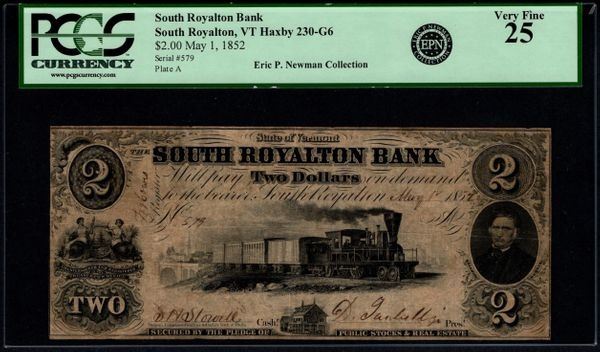 One 1852 $2 South Royalton VT National Note PCGS 25.