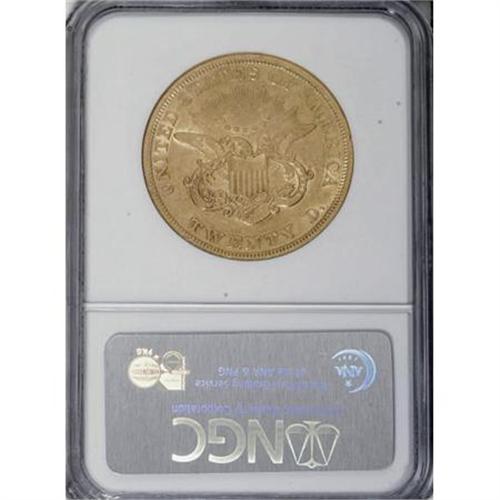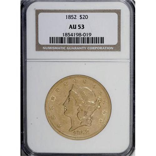 <B>1852 $20 AU53 NGC.</B></I> Attractive yellow-gold surfaces display generally well defined design elements, as well as residual luster in the protected areas. We note fewer contact marks than what might be expected. The <I>S.S. Central America</B></I> and <I>S.S. Republic</B></I> wrecks contained about 130 1852 specimens.<BR><BR><b>Shipping:</b> Coins & Currency (<a target="_blank" href="http://www.heritageauctions.com/common/shipping.php">view shipping information</a>)