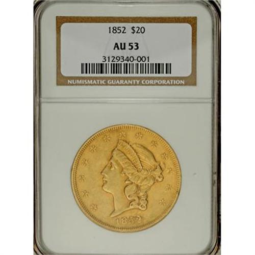<B>1852 $20 AU53 NGC.</B></I> Deep orange-gold fields show subtle luster in the fields. Excellent definition for this early Philadelphia issue, though a touch of wear affects the central devices. Light, scattered flaws preclude a Choice AU designation.<BR><BR><B>Coin Engraver:</B> James B. Longacre<BR><BR><b>Shipping:</b> Coins & Currency (<a target="_blank" href="http://www.heritageauctions.com/common/shipping.php">view shipping information</a>)