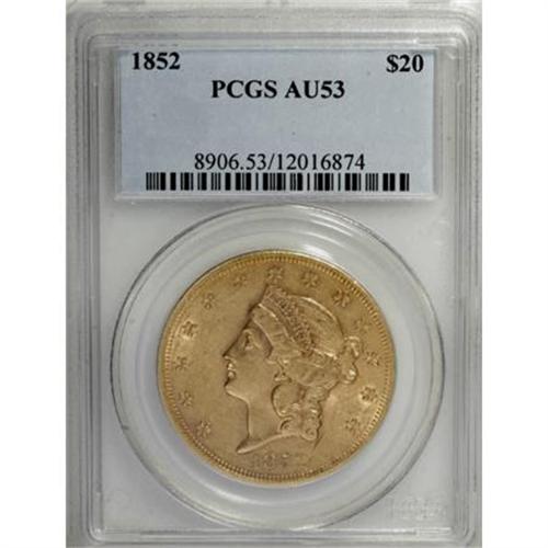 <B>1852 $20 AU53 PCGS.</B></I> Honey-gold surfaces show traces of luster in the recessed areas. Well impressed, with a scattering of minute marks.<BR><I>From The York/Hallenbeck #2 Current Finest PCGS Registry Set of Liberty Double Eagles.</B></I><BR><BR><B>Coin Engraver:</B> James B. Longacre<BR><BR><b>Shipping:</b> Coins & Currency (<a target="_blank" href="http://www.heritageauctions.com/common/shipping.php">view shipping information</a>)