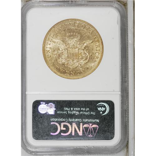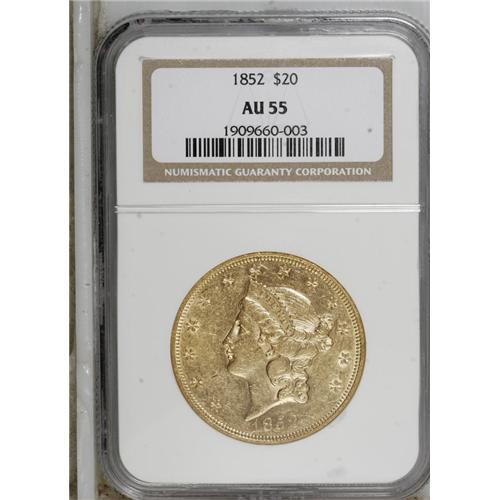 <B>1852 $20 AU55 NGC.</B></I> Luster individually outlines the obverse stars, and connects the reverse legends. The devices also exhibit substantial luster. Moderately abraded, as expected of a large denomination gold coin that has served briefly in commerce.<BR><BR><b>Shipping:</b> Coins & Currency (<a target="_blank" href="http://www.heritageauctions.com/common/shipping.php">view shipping information</a>)