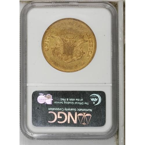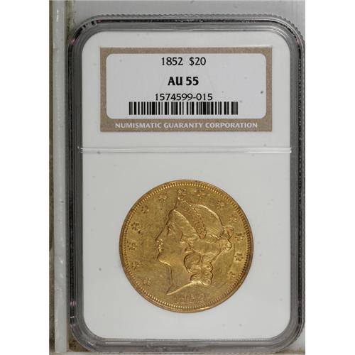 <B>1852 $20 AU55 NGC.</B></I> One of the common Type One twenties, the 1852 makes an excellent type coin in Choice AU condition. Well, but not fully struck, the orange-gold surfaces retain generous amounts of mint luster around the devices.<BR><BR><b>Shipping:</b> Coins & Currency (<a target="_blank" href="http://www.heritageauctions.com/common/shipping.php">view shipping information</a>)