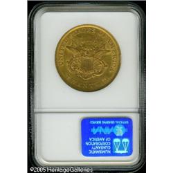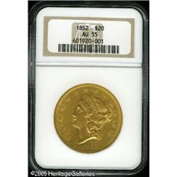 <B>1852 $20 AU55 NGC.</B></I> Original and quite well struck, with a few scattered, superficial abrasions. Light wear seems evident on the tip of the coronet, and the smooth surfaces have a pleasing matte-like texture. A relatively high grade example of this early double eagle. Lot:8929