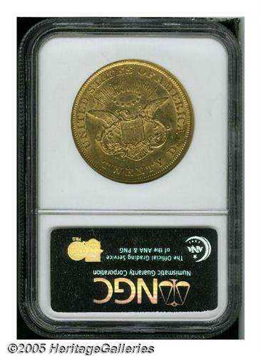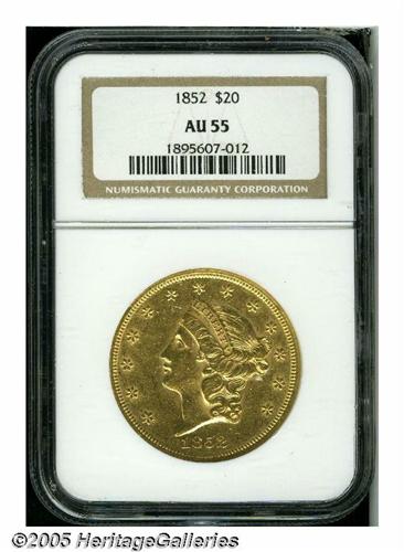 <B>1852<$20> AU55 NGC.</B></I> Yellow-gold surfaces retain luster in the areas around, and in the recesses of, the design elements. All of the devices are well impressed. Numerous tiny contact marks are scattered about, though none are worthy of individual mention.
