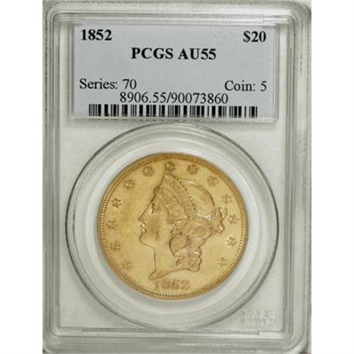 <B>1852 $20 AU55 PCGS.</B></I> Pleasingly detailed despite light highpoint wear. This luminous butter-yellow piece, one of slightly over 2 million struck, shows assorted faint marks and a few more significant abrasions, including a few on the portrait.<BR><BR><B>Coin Engraver:</B> James B. Longacre<BR><BR><b>Shipping:</b> Coins & Currency (<a target="_blank" href="http://www.heritageauctions.com/common/shipping.php">view shipping information</a>)
