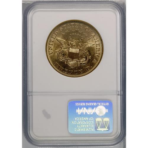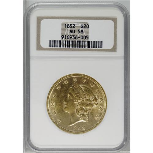 <B>1852<$20> AU58 NGC.</B></I> This intricately struck early double eagle displays substantial luster. The obverse field has typical marks, but these have toned over and are inconspicuous. The left obverse border features a wire rim. Struck from lightly clashed dies.