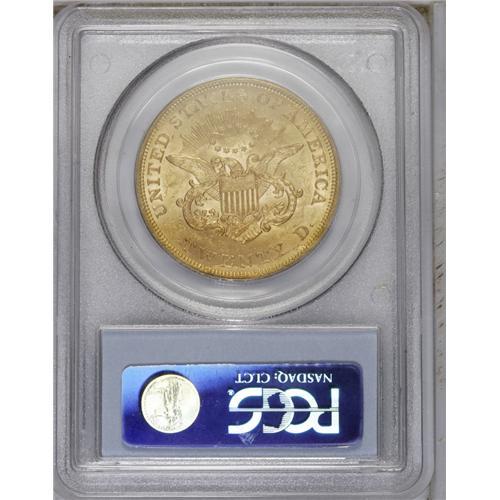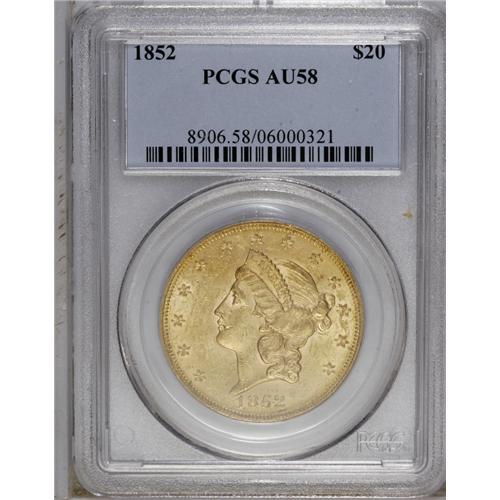 1852 $20 AU58 PCGS. A hint of friction on the sharply