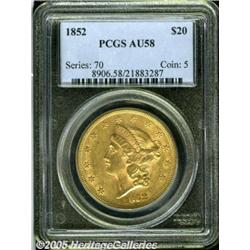 <B>1852 $20 AU58 PCGS.</B></I> Breen-7152. The date is boldly repunched north. Straw-gold patina, with traces of luster in some of the recessed areas. Population: 48 in 58, 42 finer (1/05).