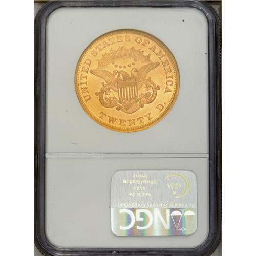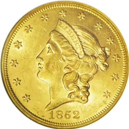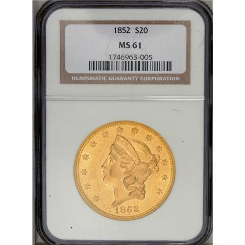 <B>1852<$20> MS61 NGC.</B></I> This is a wonderful Mint State example, and seldom encountered so fine. All of the design elements are sharply detailed, and the brilliant surfaces exhibit lovely orange-gold luster. For the collector of Mint State Liberty double eagles, this otherwise common issue may prove to be a challenge. Only 50 to 75 Mint State examples of this date exist, according to estimates by Dave Bowers in the <I>Double Eagle Guide Book.</B></I> It is fascinating that the estimated surviving population, including both certified and non-certified pieces, is actually less than the total number graded by PCGS and NGC, suggesting a substantial number of resubmissions, as well as few coins that have not been submitted.<BR><I>From The New York Eye Appeal Collection.</B></I>