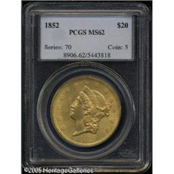 <B>1852 $20 MS62 PCGS.</B></I> By Type One Double Eagle standards, the 1852-P is considered a common date. This statement, however, refers to <I>all</B></I> 1852 twenties, not high-grade, Mint State examples, which are extremely elusive. This piece is exceptionally free of the abrasions and noticeable marks so often encountered on these heavy coins. Boldly struck with satin-textured luster, beautifully smooth matte-like fields, on each side, and some green-gold patina gained from years of storage. An excellent early Double Eagle type coin.<BR><I>From The Richard J. Chouinard Collection of United States Coins, Part Two.</B></I> Lot:8935