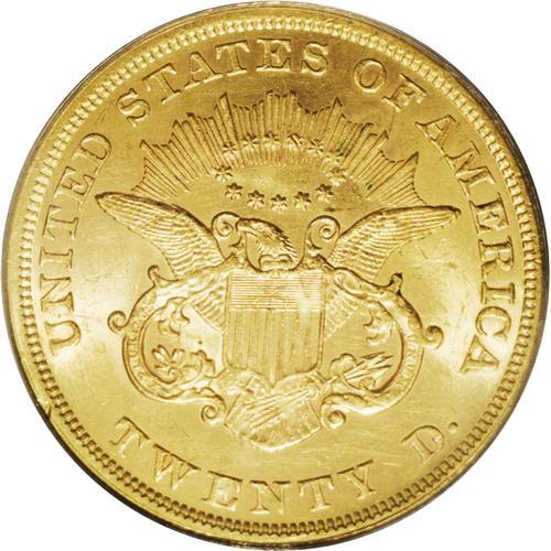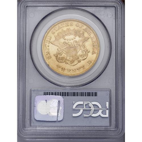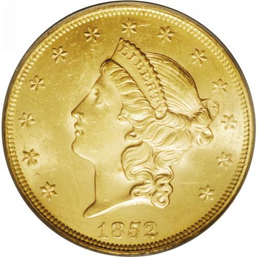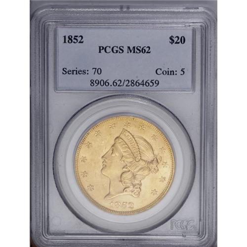 <B>1852 $20 MS62 PCGS.</B></I> While its availability in lesser grade typecasts this early issue as common by Type One standards, any Mint State example of this type is considered an important offering. This appealing reddish-golden example is noteworthy not only for its razor sharp detail, but it is also far more vibrant than the occasional Uncirculated representative. Surface marks on the obverse tend to be rather large and include a shallow scratch down Liberty's neck. Population: 22 in 62, 10 finer (1/06).