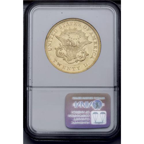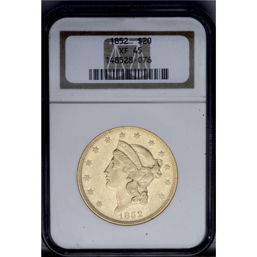 <B>1852<$20> XF45 NGC.</B></I> Pale green-gold coloration adorns the moderately worn surfaces of this fetching example. Numerous minor marks and a few larger abrasions are noted. Quite lustrous for the grade.<BR><I>From The Steve Glenn Collection.</B></I> <BR><BR><B>Important notice:</B> Heritage usually auctions material at the rate of 200-250 lots per hour. On some occasions eBay Live bid software or the Internet may not be able to keep up with the pace of the auction. We recommend placing a realistic absentee bid now as insurance to avoid disappointment. Occasionally the auctioneer may eliminate or reject an eBay Live bid, and the auctioneer may also reopen a lot after the close of the eBay live bidding (usually because we missed an audience bid), and may reject your bid even if it shows you as the winning bidder. By bidding via eBay Live, you agree that Heritage may award the lot to another bidder at its sole discretion under the circumstances described above or any other reasonable circumstances. Since eBay bids are not shown to us until we open the lot on the floor, we treat those bids just like floor bids. In most cases the floor responds before the eBay bid is presented to us, due to Internet lag time, so for consistency we have made it a policy that floor bids are always considered first over tie eBay live bids. Also please note that all Heritage lots purchased through eBay Live carry a 20% Buyer's Premium. Please make sure you read the Terms and Conditions before you bid. This lot is being auctioned in conjunction with a live floor auction by Heritage Galleries & Auctioneers. All final auction and invoice information will be supplied by Heritage Galleries & Auctioneers, and all other information should be considered preliminary. Lot:4181 <BR><BR><B>Winning Notification and Billing:</B> After the FINAL session in this auction is complete, Heritage will send e-mail and snail mail invoices. This process normally takes several days. All final auction and invoice information will be supplied by Heritage Galleries & Auctioneers, and all other information should be considered preliminary. <BR><BR>This auction will be conducted on a live auction floor and over the Internet through eBay Live. If you choose to place an absentee bid, please take a moment to <font color='#0000ff'><u><a href='http://pages.ebay.com/liveauctions/help/before/laabsentee.html'>learn how eBay Live absentee bidding works</a></u></font><font color='#000000'>