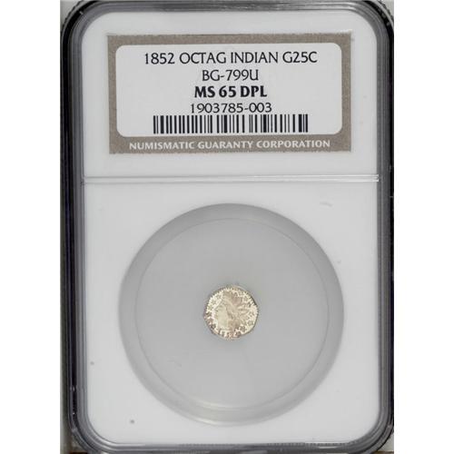 <B>1852 25C Indian Octagonal 25 Cents, BG-799U, High R.5, MS65 Deep Mirror Prooflike NGC.</B></I> The only example of this issue to be awarded the Deep Mirror Prooflike designation, and well-deserved, as the intense reflectivity and contrast would be difficult to rival. A remarkably well-preserved piece.<BR><BR><b>Shipping:</b> Coin/Currency (<a target="_blank" href="http://www.heritageauctions.com/common/shipping.php">view shipping information</a>)