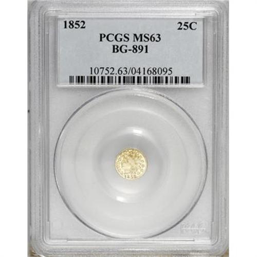 <B>1852 25C Indian Round 25 Cents, BG-891, Low R.5, MS63 PCGS.</B></I> PCGS Population (9/22). NGC Census: (3/2). (#10752)<BR><BR><b>Shipping:</b> Coins & Currency (<a target="_blank" href="http://www.heritageauctions.com/common/shipping.php">view shipping information</a>)