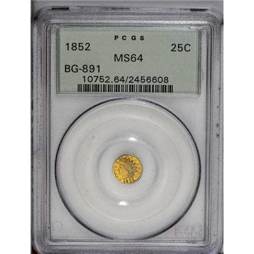 <B>1852<25C> Indian Round 25 Cents, BG-891, Low R.5, MS64 PCGS.</B></I> Typically struck with highly reflective reddish-orange surfaces. An elusive piece with a reverse rotated 90 degrees, housed in a green label holder. Population: 10 in 64, 12 finer (8/06).