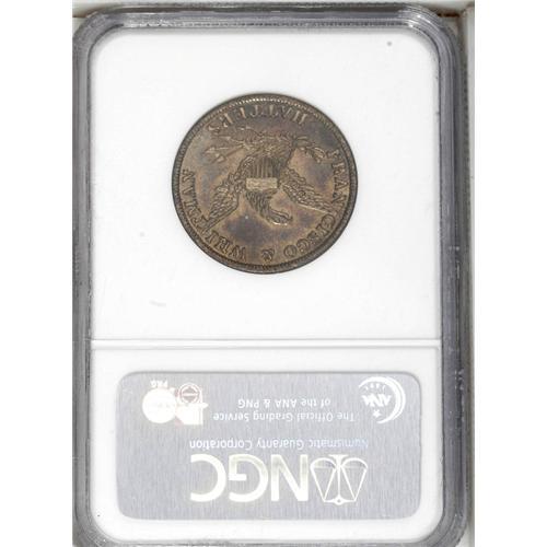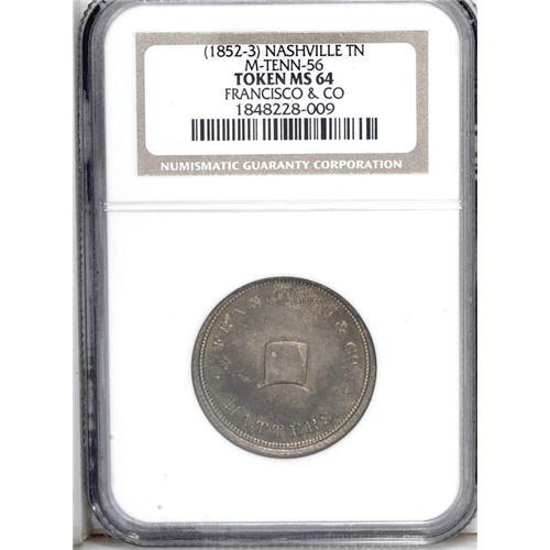 <B>(1852-3) Nashville, Tennessee, Francisco and Co. Hatters, MS64 NGC.</B></I> This obverse features a man's top hat in the center, the difference from the other varieties is that the obverse reads Francisco and Co. Hatters, not Francisco and Whitman. Brass, 29mm, plain edge. Light overall toning; dark brown pleasing patina. Listed as Tenn-55.