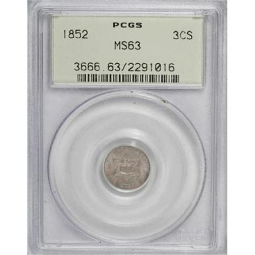 <B>1852 3CS MS63 PCGS.</B></I> PCGS Population (308/558). NGC Census: (233/672). Mintage: 18,663,500. Numismedia Wsl. Price for NGC/PCGS coin in MS63: $212. (#3666)<BR><BR><B>Coin Engraver:</B> James B. Longacre<BR><BR><b>Shipping:</b> Coins & Currency (<a target="_blank" href="http://www.heritageauctions.com/common/shipping.php">view shipping information</a>)