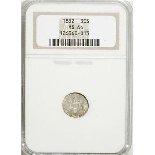 <B>1852 3CS MS64 NGC.</B></I> NGC Census: (424/254). PCGS Population (315/249). Mintage: 18,663,500. Numismedia Wsl. Price for NGC/PCGS coin in MS64: $376. (#3666)<BR><BR><B>Coin Engraver:</B> James B. Longacre<BR><BR><b>Shipping:</b> Coins & Currency (<a target="_blank" href="http://www.heritageauctions.com/common/shipping.php">view shipping information</a>)