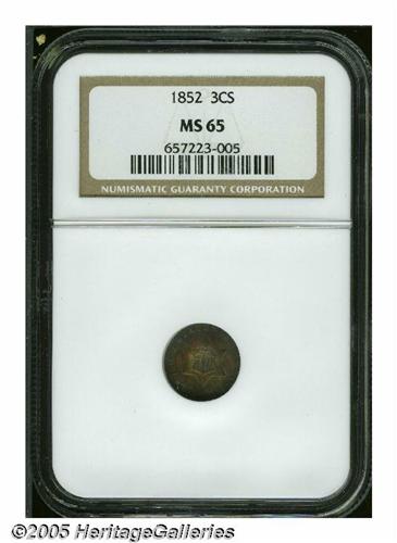 <B>1852<3CS> MS65 NGC.</B></I> The deepest imaginable toning blankets each side of this Gem. Chartreuse, crimson, and magenta are among the colors displayed. The piece is well struck, with no obvious clash marks, and seems to be pristine. A potential prize for the connoisseur of spectacularly toned silver type coins.