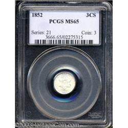 <table><tr><td><TABLE cellSpacing=0 cellPadding=0 width="100%" bgColor=#000000 border=0><TBODY> <TR><TD width="100%"><TABLE cellSpacing=1 cellPadding=3 width="100%" border=0><TBODY><TR><TD width="100%" bgColor=#79735c><FONT face=arial color=#ffffff size=3><B>Description</B> </FONT></TD></TR><TR><TD width="100%" bgColor=#ffffff><FONT face=arial size=2><B>1852 3CS MS65 PCGS.</B></I> Bright, frosty, and presenting as untoned overall. The strike is unusually sharp on this tiny type coin. Scarce as a Gem. </FONT></TD></TR></TBODY></TABLE></TD></TR></TBODY></TABLE><BR><A name=PricesRealized></A><TABLE cellSpacing=0 cellPadding=0 width="100%" bgColor=#000000 border=0><TBODY><TR><TD width="100%"><TABLE cellSpacing=1 cellPadding=3 width="100%" border=0><TBODY><TR><TD width="100%" bgColor=#79735c><A name=PR><FONT face=arial color=#ffffff size=3><B>Previous Prices from Heritage Auctions</B> </FONT></A></TD></TR><TR><TD bgColor=#f6f6ed><TABLE cellSpacing=0 cellPadding=0 width="100%" border=1><TBODY><TR><TD align=middle width="33%"><B>Date</B></TD><TD align=middle width="33%"><B>Service</B></TD><TD align=middle width="33%"><B>Price</B></TD></TR><TR bgColor=whitesmoke><TD width="33%"><B>09/23/2003</B></TD><TD width="33%">PCGS</TD><TD width="33%">$690.00</TD></TR><TR bgColor=whitesmoke><TD width="33%"><B>07/08/2003</B></TD><TD width="33%">NGC</TD><TD width="33%">$603.75</TD></TR><TR bgColor=whitesmoke><TD width="33%"><B>11/19/2002</B></TD><TD width="33%">PCGS</TD><TD width="33%">$603.75</TD></TR><TR bgColor=whitesmoke><TD width="33%"><B>11/12/2002</B></TD><TD width="33%">PCGS</TD><TD width="33%">$603.75</TD></TR><TR bgColor=whitesmoke><TD width="33%"><B>04/09/2002</B></TD><TD width="33%">NGC</TD><TD width="33%">$506.00</TD></TR><TR bgColor=whitesmoke><TD width="33%"><B>09/11/2001</B></TD><TD width="33%">PCGS</TD><TD width="33%">$700.00</TD></TR><TR bgColor=whitesmoke><TD width="33%"><B>06/05/2001</B></TD><TD width="33%">NGC</TD><TD width="33%">$600.00</TD></TR><TR bgColor=whitesmoke><TD width="33%"><B>02/13/2001</B></TD><TD width="33%">NGC</TD><TD width="33%">$575.00</TD></TR><TR bgColor=whitesmoke><TD width="33%"><B>01/30/2001</B></TD><TD width="33%">PCGS</TD><TD width="33%">$726.00</TD></TR><TR bgColor=whitesmoke><TD width="33%"><B>09/26/2000</B></TD><TD width="33%">NGC</TD><TD width="33%">$700.00</TD></TR><TR bgColor=whitesmoke><TD width="33%"><B>01/11/2000</B></TD><TD width="33%">NGC</TD><TD width="33%">$675.00</TD></TR><TR bgColor=whitesmoke><TD width="33%"><B>12/14/1999</B></TD><TD width="33%">NGC</TD><TD width="33%">$575.00</TD></TR><TR bgColor=whitesmoke><TD width="33%"><B>09/22/1999</B></TD><TD width="33%">NGC</TD><TD width="33%">$625.00</TD></TR><TR bgColor=whitesmoke><TD width="33%"><B>07/29/2003</B></TD><TD width="33%">NGC</TD><TD width="33%">$805.00</TD></TR><TR bgColor=whitesmoke><TD width="33%"><B>01/11/2003</B></TD><TD width="33%">NGC</TD><TD width="33%">$632.50</TD></TR><TR bgColor=whitesmoke><TD width="33%"><B>01/11/2003</B></TD><TD width="33%">PCGS</TD><TD width="33%">$787.75</TD></TR><TR bgColor=whitesmoke><TD width="33%"><B>09/28/2002</B></TD><TD width="33%">PCGS</TD><TD width="33%">$747.50</TD></TR><TR bgColor=whitesmoke><TD width="33%"><B>01/12/2002</B></TD><TD width="33%">NGC</TD><TD width="33%">$506.00</TD></TR><TR bgColor=whitesmoke><TD width="33%"><B>11/15/2001</B></TD><TD width="33%">PCGS</TD><TD width="33%">$632.50</TD></TR><TR bgColor=whitesmoke><TD width="33%"><B>08/08/2001</B></TD><TD width="33%">NGC</TD><TD width="33%">$546.25</TD></TR><TR bgColor=whitesmoke><TD width="33%"><B>05/31/2001</B></TD><TD width="33%">PCGS</TD><TD width="33%">$661.25</TD></TR><TR bgColor=whitesmoke><TD width="33%"><B>02/23/2001</B></TD><TD width="33%">NGC</TD><TD width="33%">$488.75</TD></TR><TR bgColor=whitesmoke><TD width="33%"><B>08/07/2000</B></TD><TD width="33%">ANACS</TD><TD width="33%">$575.00</TD></TR><TR bgColor=whitesmoke><TD width="33%"><B>06/10/2000</B></TD><TD width="33%">NGC</TD><TD width="33%">$603.75</TD></TR><TR bgColor=whitesmoke><TD width="33%"><B>02/11/2000</B></TD><TD width="33%">PCGS</TD><TD width="33%">$718.75</TD></TR><TR bgColor=whitesmoke><TD width="33%"><B>02/12/2000</B></TD><TD width="33%">NGC</TD><TD width="33%">$632.50</TD></TR><TR bgColor=whitesmoke><TD width="33%"><B>10/10/1999</B></TD><TD width="33%">NGC</TD><TD width="33%">$509.45</TD></TR><TR bgColor=whitesmoke><TD width="33%"><B>08/13/1999</B></TD><TD width="33%">PCGS</TD><TD width="33%">$701.50</TD></TR><TR bgColor=whitesmoke><TD width="33%"><B>08/07/1998</B></TD><TD width="33%">NGC</TD><TD width="33%">$488.75</TD></TR><TR bgColor=whitesmoke><TD width="33%"><B>06/06/1998</B></TD><TD width="33%">PCGS</TD><TD width="33%">$718.75</TD></TR><TR bgColor=whitesmoke><TD width="33%"><B>08/02/1997</B></TD><TD width="33%">PCGS</TD><TD width="33%">$747.50</TD></TR><TR bgColor=whitesmoke><TD width="33%"><B>10/04/1997</B></TD><TD width="33%">PCGS</TD><TD width="33%">$687.50</TD></TR><TR bgColor=whitesmoke><TD width="33%"><B>02/22/1997</B></TD><TD width="33%">PCGS</TD><TD width="33%">$880.00</TD></TR><TR bgColor=whitesmoke><TD width="33%"><B>11/17/1995</B></TD><TD width="33%">NGC</TD><TD width="33%">$577.50</TD></TR><TR bgColor=whitesmoke><TD width="33%"><B>02/03/1995</B></TD><TD width="33%">NGC</TD><TD width="33%">$577.50</TD></TR><TR bgColor=whitesmoke><TD width="33%"><B>01/04/1995</B></TD><TD width="33%">PCGS</TD><TD width="33%">$924.00</TD></TR><TR bgColor=whitesmoke><TD width="33%"><B>01/01/1995</B></TD><TD width="33%">NGC</TD><TD width="33%">$743.00</TD></TR><TR bgColor=whitesmoke><TD width="33%"><B>05/01/1999</B></TD><TD width="33%">NGC</TD><TD width="33%">$935.00</TD></TR><TR bgColor=whitesmoke><TD width="33%"><B>05/01/1999</B></TD><TD width="33%">NGC</TD><TD width="33%">$660.00</TD></TR><TR bgColor=whitesmoke><TD width="33%"><B>09/01/1998</B></TD><TD width="33%">NGC</TD><TD width="33%">$977.00</TD></TR><TR bgColor=whitesmoke><TD width="33%"><B>03/01/2000</B></TD><TD width="33%">NGC</TD><TD width="33%">$575.00</TD