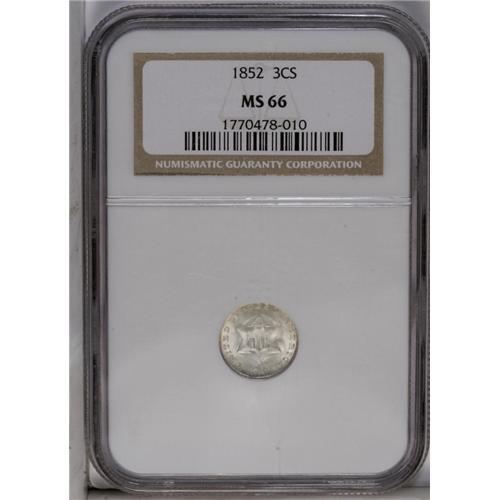 <B>1852<3CS> MS66 NGC.</B></I> A well-preserved and virtually untoned trime with frosty luster and bold details. The overall eye appeal is superb. Census: 70 in 66, 11 finer (7/06).