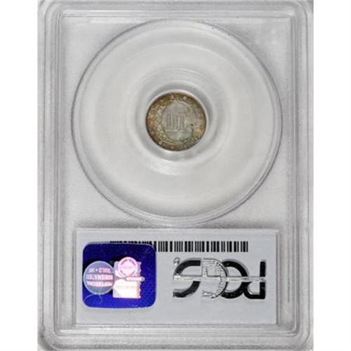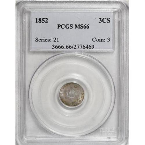<B>1852 3CS MS66 PCGS.</B></I> Violet, silver-gray, gold-orange, and crimson patina graces the satiny surfaces, and the design elements are well struck. An attractive representative of this early Type One trime. Population: 76 in 66, 13 finer (6/07).<BR><BR><B>Coin Engraver:</B> James B. Longacre<BR><BR><b>Shipping:</b> Coins & Currency (<a target="_blank" href="http://www.heritageauctions.com/common/shipping.php">view shipping information</a>\)