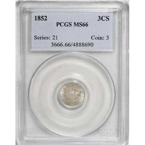 <B>1852 3CS MS66 PCGS.</B></I> Lustrous surfaces display a melange of pastel gray, lilac, tan, and sky-blue toning, and are nicely preserved. A typical strike is seen on the design elements. Population: 76 in 66, 13 finer (7/07).<BR><BR><B>Coin Engraver:</B> James B. Longacre<BR><BR><b>Shipping:</b> Coins & Currency (<a target="_blank" href="http://www.heritageauctions.com/common/shipping.php">view shipping information</a>\)