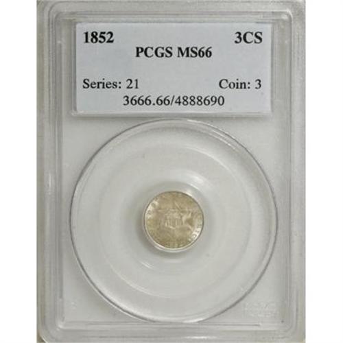 <B>1852 3CS MS66 PCGS.</B></I> This trime's lustrous surfaces display a melange of pastel gray, lilac, tan, and sky-blue toning. Well struck and delightfully preserved, an impressive survivor. PCGS has graded 13 finer pieces (1/08).<BR><BR><B>Coin Engraver:</B> James B. Longacre<BR><BR><b>Shipping:</b> Coins & Currency (<a target="_blank" href="http://www.heritageauctions.com/common/shipping.php">view shipping information</a>)