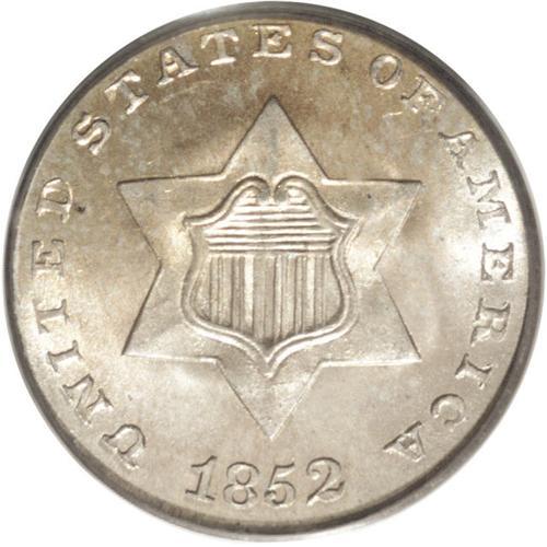 <B>1852<3CS> MS67 PCGS.</B></I> A splendid Type One coin that has thick mint frost over each side and virtually flawless gold-gray surfaces. One of the most surprising features on this coin is the uniform strength of strike seen over each side. Only a trace of softness is visible in the center of the shield. Very scarce in such a lofty grade. Population: 10 in 67, 2 finer (7/06).