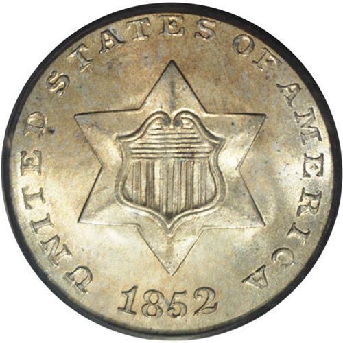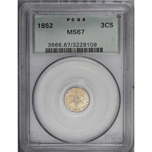 <B>1852<3CS> MS67 PCGS.</B></I> A splendid Type One coin that has thick mint frost over each side and virtually flawless surfaces. One of the most surprising features on this coin is the uniform strength of strike seen over each side. Only a trace of softness is observed in the center of the shield. Light gray-golden color is seen over the bright, frosted luster. Very scarce in such a superior grade. Population: 10 in 67, 2 finer (2/06).
