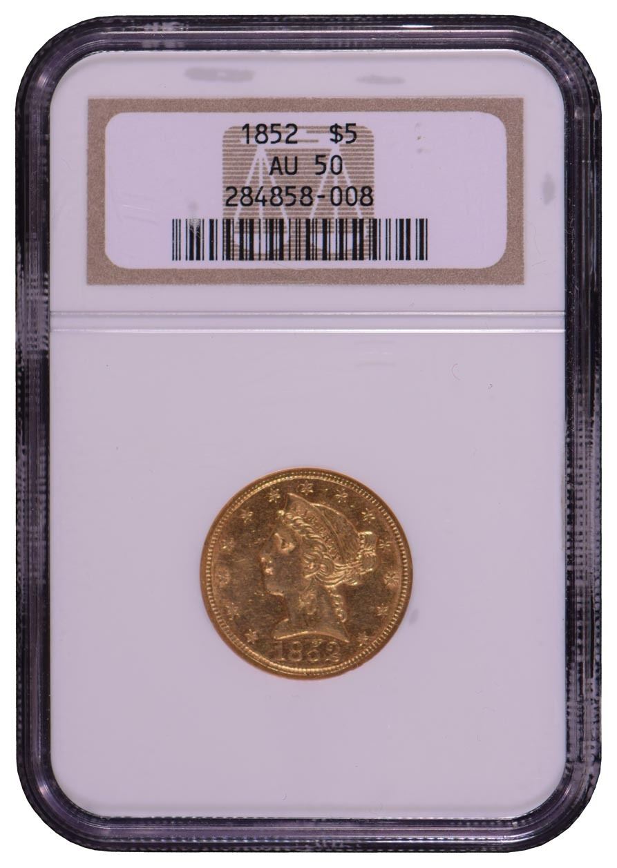 One 1852 $5 Liberty Head Half Eagle Gold Coin NGC AU50.