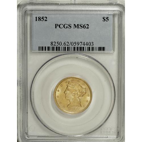 1852 $5 MS62 PCGS. This is a bright, frosty coin with