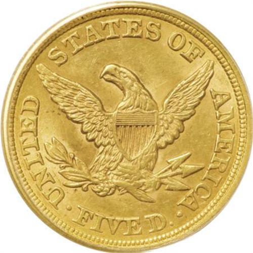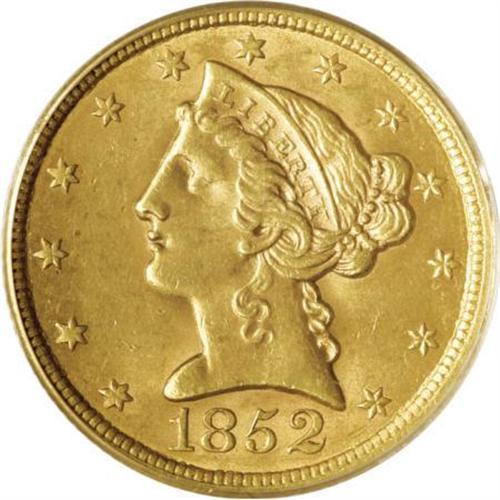 <B>1852 $5 MS62 PCGS.</B></I> The mintage of nearly 574,000 pieces in 1852 is one of the highest for the Liberty Head No Motto type five dollar. While the date is fairly common in circulated grades, Jeff Garrett and Ron Guth (2006) say "Mint State coins are scarce, and there are probably fewer than 150 pieces known at that level." Soft luster emanates from the green-gold surfaces of this MS62 specimen. Sharply struck, and showing just a few minute handling marks. Population: 50 in 62, 31 finer (8/07).<BR><BR><B>Coin Engraver:</B> Christian Gobrecht<BR><BR><b>Shipping:</b> Coins & Currency (<a target="_blank" href="http://www.heritageauctions.com/common/shipping.php">view shipping information</a>)