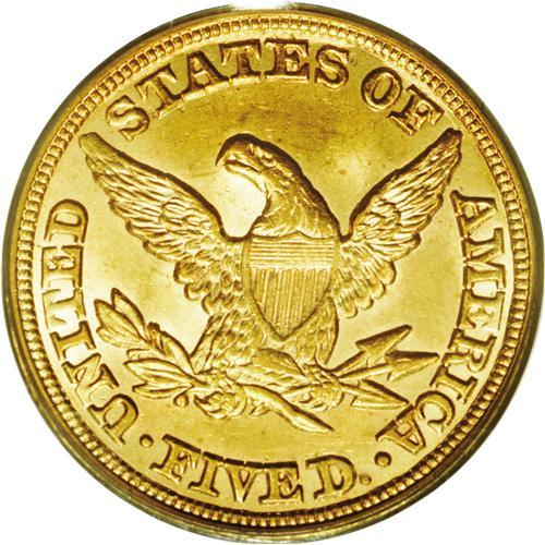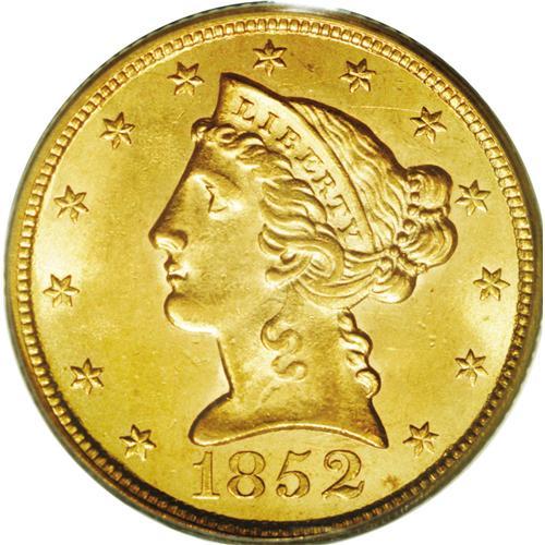 <B>1852<$5> MS63 PCGS.</B></I> Lustrous and well frosted with rich reddish-golden color throughout. The strike is well executed in most areas, although noticeably lacking on the eagle's neck and left (facing) wingtip. The 1852 is one of the more available No Motto fives in Mint State, but few Uncirculated pieces surpass the MS60-62 range. Population: 16 in 63, 9 finer (4/06).