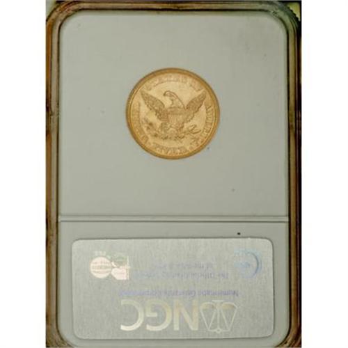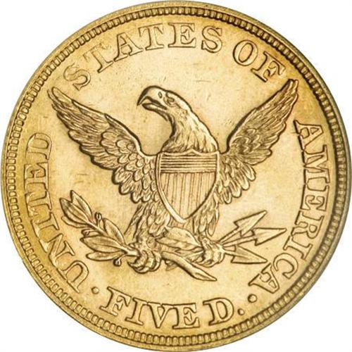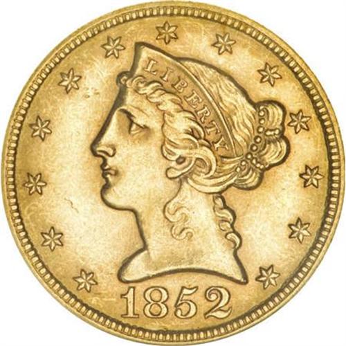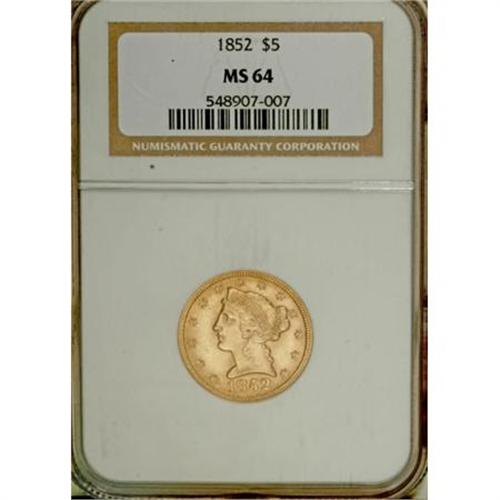 <B>1852 $5 MS64 NGC.</B></I> Despite a plentiful mintage of over half a million pieces, the 1852 is not as available as one might expect in the better states of preservation. Garrett and Guth (2006) comment on this issue: "Mint State coins are scarce, and there are probably fewer than 150 pieces known at that level. Choice examples are surprisingly rare."<BR> This bright, satiny example is predominantly pale apricot-gold with occasional orange and lilac accents. The strike is bold overall, though a touch of softness is present at the eagle's neck feathers, and the only individually mentionable flaw is a reed mark in front of Liberty's chin. Outstanding condition for the issue and for the series in general, a remarkable type piece. NGC has graded just three coins finer, while PCGS acknowledges none (11/07).<BR><BR><B>Coin Engraver:</B> Christian Gobrecht<BR><BR><b>Shipping:</b> Coins & Currency (<a target="_blank" href="http://www.heritageauctions.com/common/shipping.php">view shipping information</a>)
