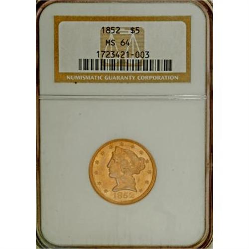 <B>1852 $5 MS64 NGC.</B></I> The 1852 half eagle is surprisingly scarce in the higher Mint State grades for an issue that saw an emission of considerably more than half a million pieces. According to the Garrett-Guth <I>Gold Encyclopedia, </B></I>the average grade of certified survivors is "AU54." NGC and PCGS combined have certified 30 pieces in MS64, with only three coins finer (12/07). <BR> For this particular coin, however, average grades and typical survivors bear little meaning, as it is an absolutely <I>stunning </B></I>high-end piece for the grade. Thick mint luster exudes from both sides, with rich sunset-orange and hazel-gray patina on the obverse and more consistent orange tones on the reverse. The strike is bold, if a trifle short of full, but this remains a nonetheless-spectacular piece worthy of some strong bidding. Census: 15 in 64, 3 finer (12/07).<BR><BR><B>Coin Engraver:</B> Christian Gobrecht<BR><BR><b>Shipping:</b> Coins & Currency (<a target="_blank" href="http://www.heritageauctions.com/common/shipping.php">view shipping information</a>)