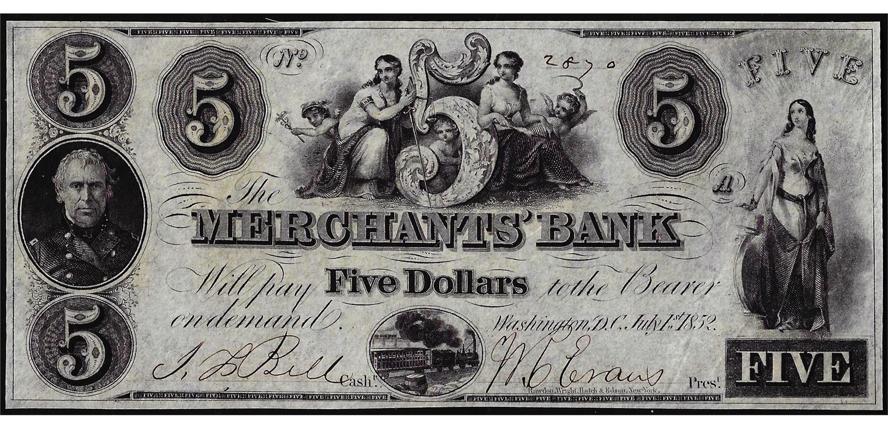 One 1852 $5 Merchants' Bank Washington DC Obsolete Currency Note.