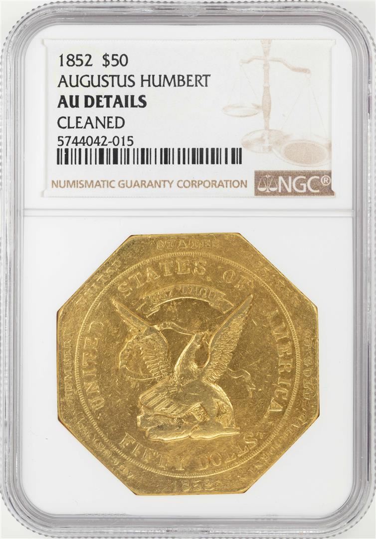 One 1852 $50 Augustus Humbert Gold Slug Coin NGC AU Details. The 1851-52 Augustus Humbert-U.S. Assay Office octagonal fifty dollar gold pieces were the Gold Rush equivalent of today taking a one-ounce American Platinum Eagle into a store to pay for groceries. The first Humbert fifty dollar octagonal coins appeared in February 1851. Don Kagin writes in Private Gold Coins and Patterns of the United States: "The new 'government' issues forced most of the inferior privately issued gold pieces out of circulation, although the private coins did not cease operations until March. The Mormon and Pacific Company coins especially were received at their true intrinsic value and remelted into $50 slugs. This sufficiently cleansed the business world of debased coins formerly tolerated because of necessity." Of course, the fifty dollar issues of 1851-52 completely failed to alleviate a more basic problem, a chronic shortage of gold coins in denominations less than fifty dollars, which the melting of the discredited coins exacerbated. Washington bureaucrats in July 1851 again rejected the call to mint smaller-denomination coins, calling it "not deemed expedient." The public view of the fifty dollar ingots continued to dim as merchants were forced to use foreign coins to make change for the large pieces. Small-denomination federal gold coins fetched premiums, while merchants would discount the fifty dollar gold coins from 2% to 4% -- as Kagin writes, "not much of an improvement over the undervalued private coinage of several months just past." Fortunately, Moffat and Company and U.S. Assay Office ten and twenty dollar pieces dated 1852 alleviated the situation -- and obviated the need for the large fifty dollar slugs, which would end with the 1852 coinage. NGC Certified.