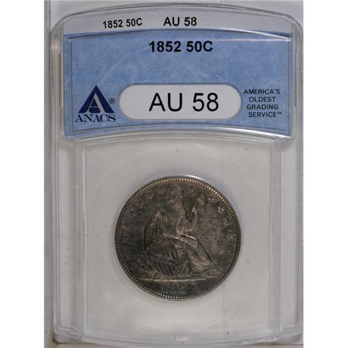 <B>1852<50C> AU58 ANACS.</B></I> This is an attractive example of this issue that boasts a low mintage of 77,130 pieces. This high grade specimen offers nice luster and strike, enhanced by mottled medium gray iridescence.