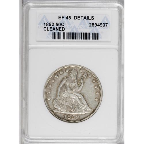 <B>1852<50C>--Cleaned--ANACS. XF45 Details.</B></I> Cleaning has obscured all traces of this coin's original mint luster. A lightly worn piece with delicate gold-gray retoning in the fields.<BR><I>From The Catfish Creek Collection, Part Two.</B></I>