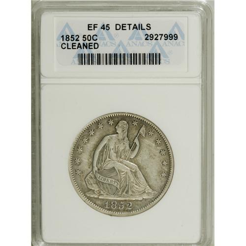 <B>1852 50C --Cleaned--ANACS. XF45 Details.</B></I> Pale tan and steel-blue toning envelop this hairlined better date Seated half. A thin mark is noted above the left (facing) wing. A portion of the 77,130 pieces struck were likely melted soon after production, since the bullion value exceeded face.<BR><I>From The Edward Sacks Collection.</B></I><BR><BR><b>Shipping:</b> Coins & Currency (<a target="_blank" href="http://www.heritageauctions.com/common/shipping.php">view shipping information</a>)