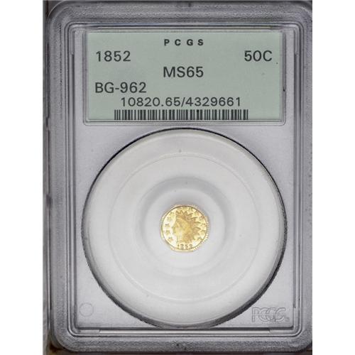 <B>1852<50C> Indian Octagonal 50 Cents, BG-962, Low R.7, MS65 PCGS.</B></I> Bright and prooflike, with lovely, green-gold colorations. Overall, a well defined example. This is tied with three others as the finest graded at PCGS.