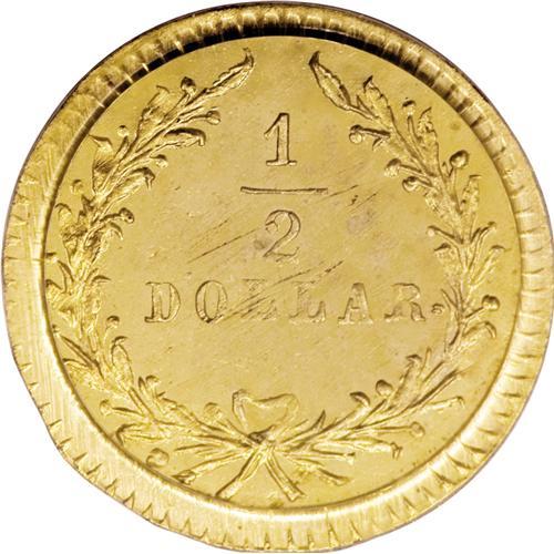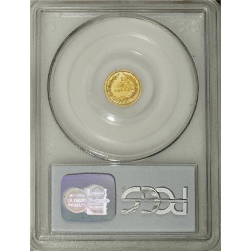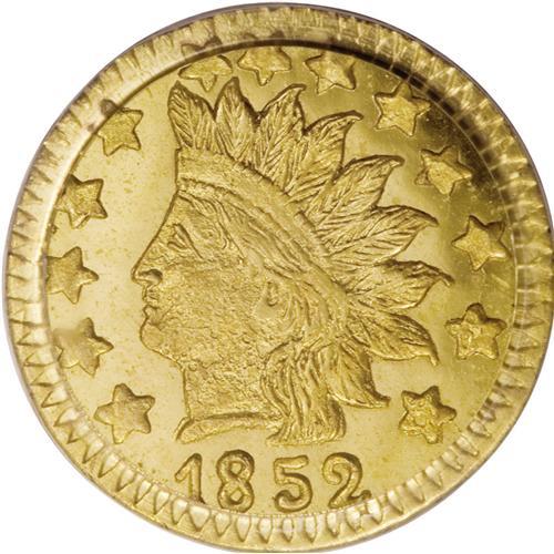 <B>1852 50C Indian Round 50 Cents, BG-1075, R.7, MS65 PCGS.</B></I> Although undesignated as such on the PCGS insert, the present piece appears to be the Jay Roe example, which was sold at auction in 9/03 by Bowers and Merena as lot 540. The present lot is also the plate coin for the variety in the second edition of Breen-Gillio. The luminous devices contrast with the reflective honey-gold fields. The central reverse field displays moderate planchet abrasions, which were uneffaced by the strike. One of two Gems graded at PCGS, with none finer at either service (4/07).<BR><BR><b>Shipping:</b> Coins & Currency (<a target="_blank" href="http://www.heritageauctions.com/common/shipping.php">view shipping information</a>)