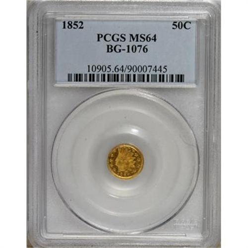 <B>1852 50C Indian Round 50 Cents, BG-1076, Low R.6, MS64 PCGS.</B></I> PCGS Population (6/1). NGC Census: (0/0). (#10905)<BR><BR><b>Shipping:</b> Coins & Currency (<a target="_blank" href="http://www.heritageauctions.com/common/shipping.php">view shipping information</a>)